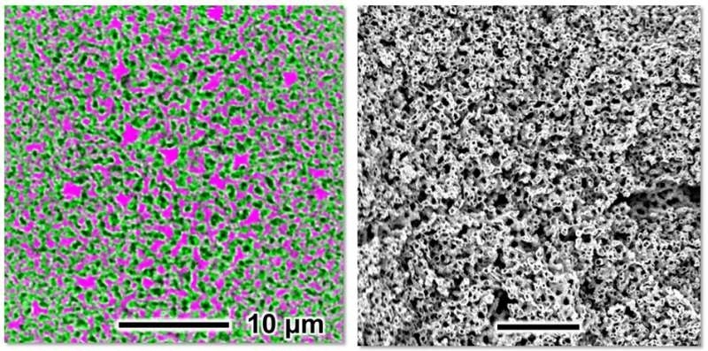 Izquierda: en la muestra se observa que el bijel está compuesto de aceite (negro), agua (magenta) y una capa ultrafina de nanopartículas (verde). Derecha: imagen de barrido revela los pequeños canales. / Fuente: Universidad de Utrecht